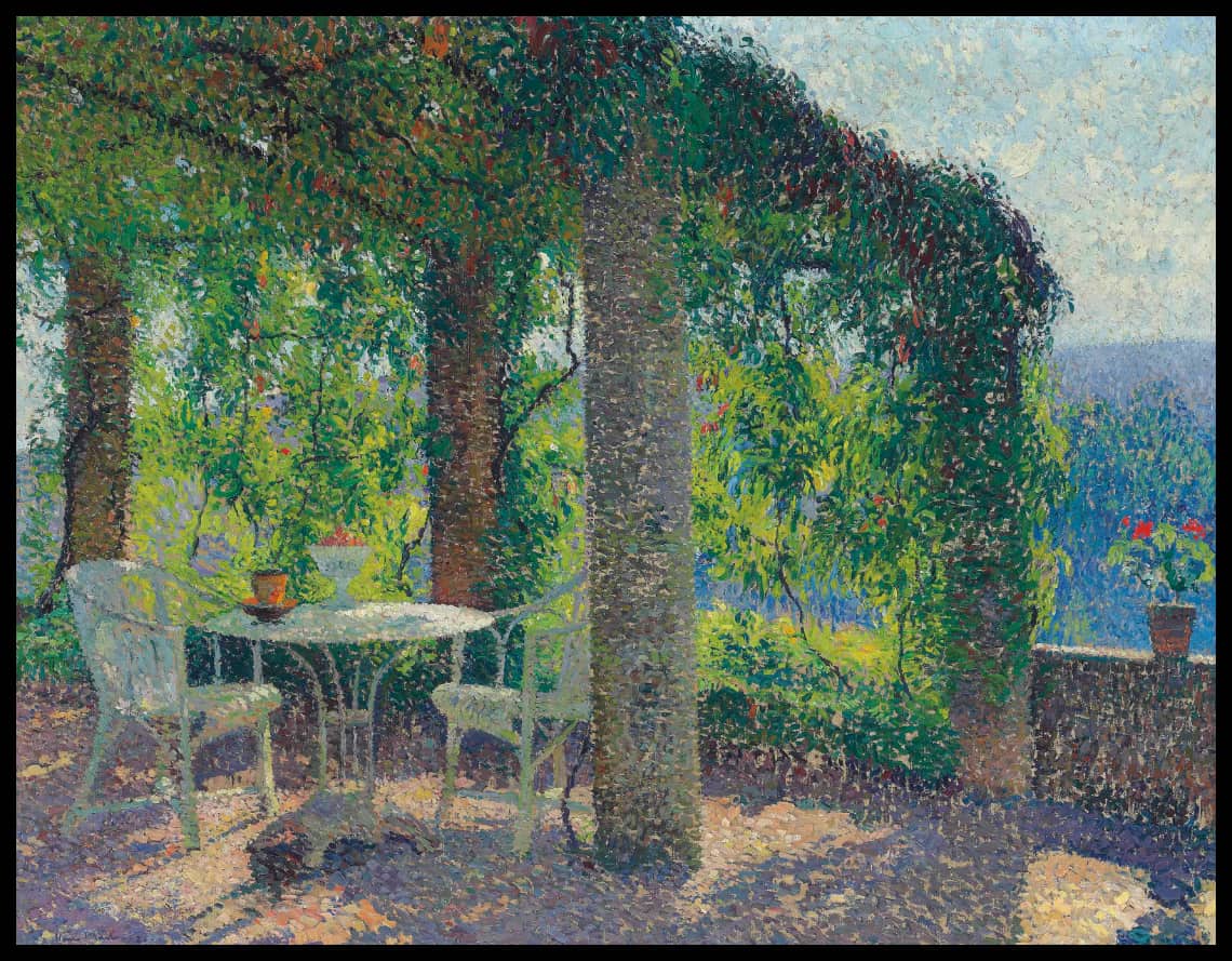 Pergola à l'angle sud du Manoir de Marquayrol dans la lumière d'un matin d'été