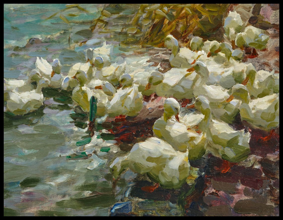 Einundzwanzig weisse Enten im Wasser