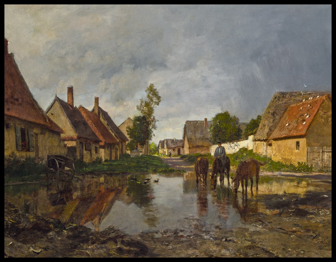 Dorfstraße mit trinkenden Pferden
