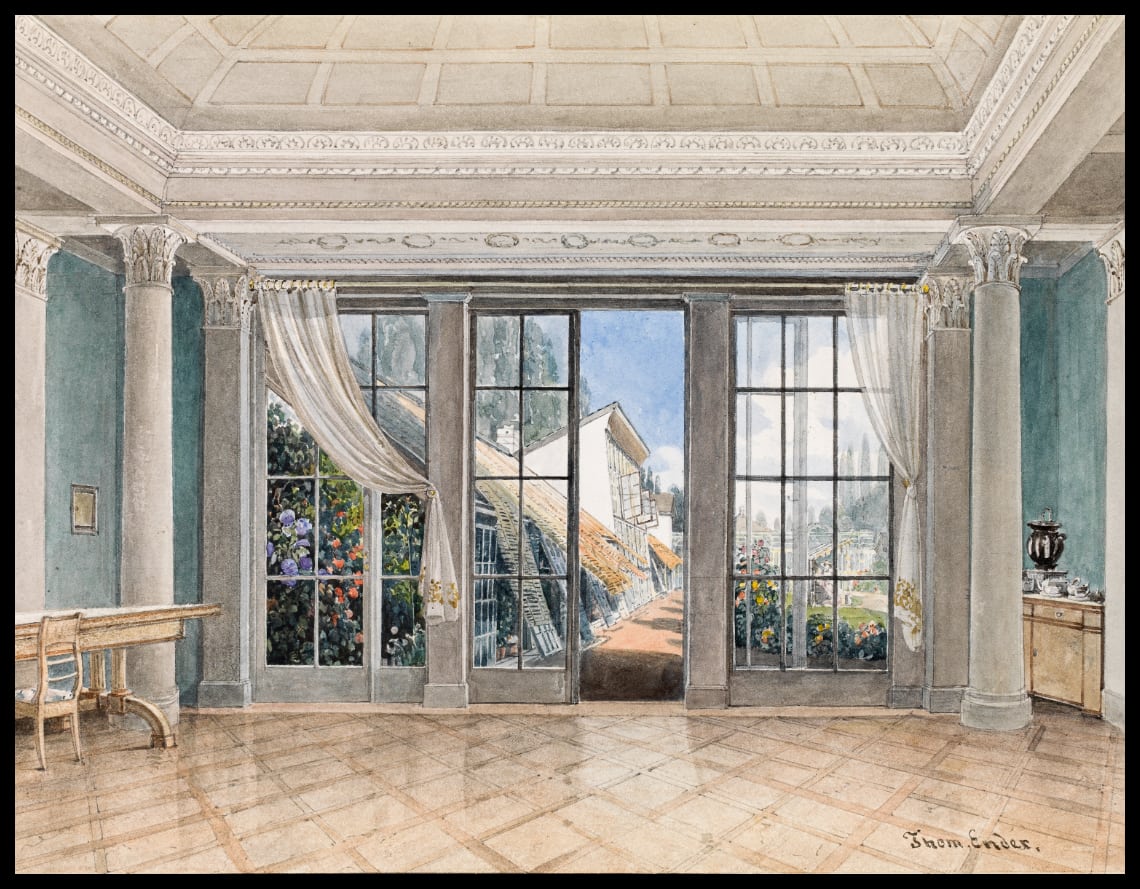 Interieur mit Ausblick in einen Garten