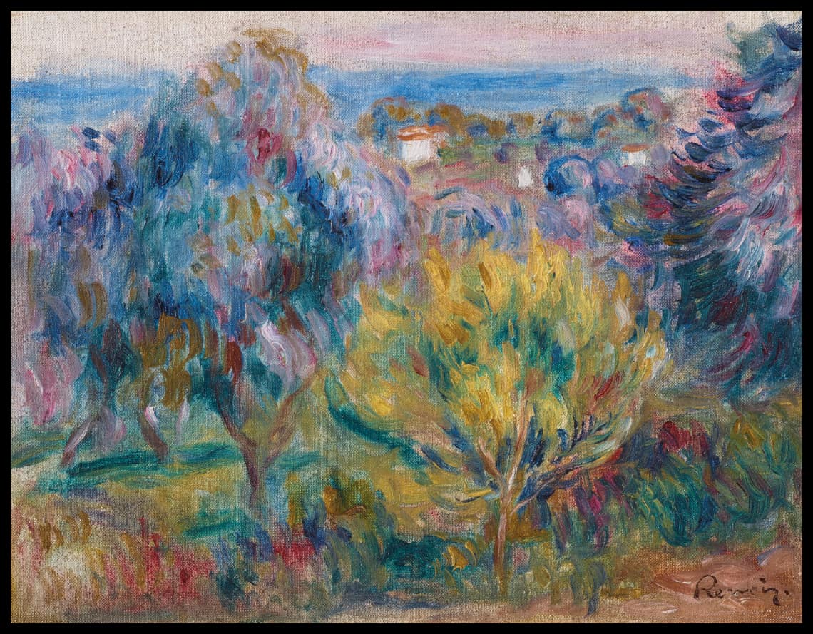 Paysage, arbre jaune au premier plan et fond de mer dans le Midi